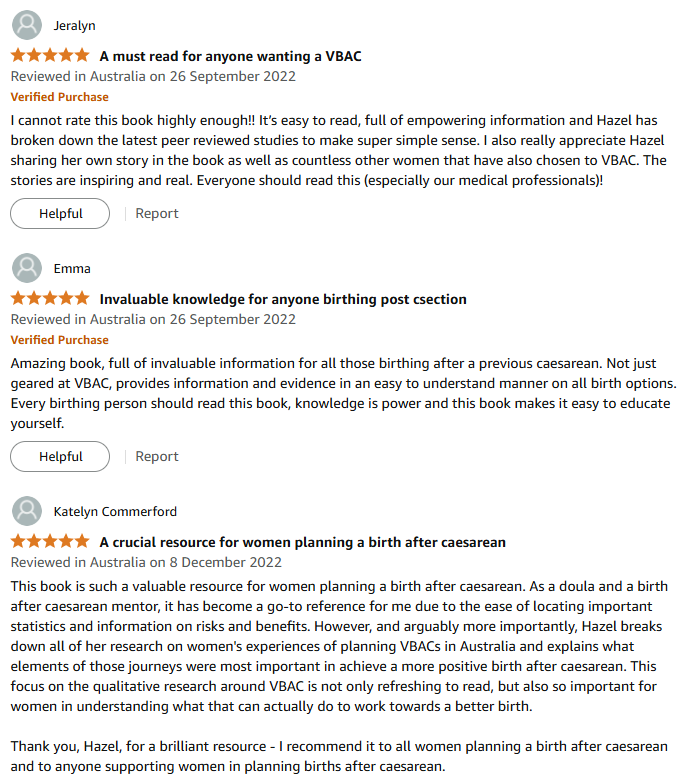 In this book Hazel Keedle explores the research around repeat caesarean and vaginal birth after caesarean (VBAC). Hazel introduces and explains the importance of the four factors to having a better birth. Using research from her PhD, Hazel gives practical advice for women and their support people on planning for a better birth. The book also includes birth stories from 15 women across the globe, from Australia to Europe and the USA. Their stories are varied and deeply personal and all planned for a better birth after caesarean.